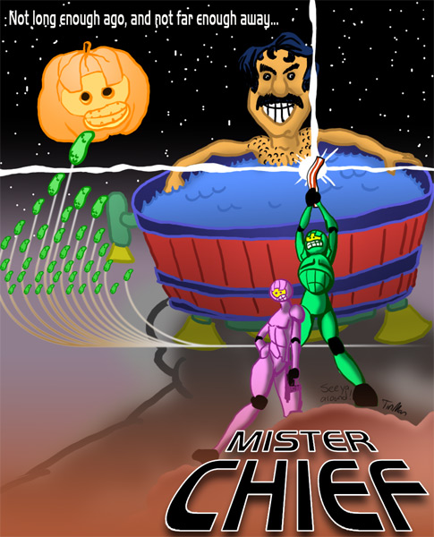 Finally, I asked myself, what would Chief look like if Andrew made a Star Wars poster on his last day at Bungie? Something like this, and note well, if you are a hot chick, Andrew is perfectly happy to make out with you and will be at Bucca De Beppo in Seattle between 8:30 and 10pm.