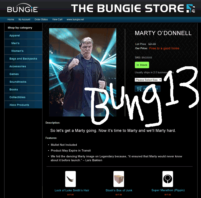Bungie Weekly Update: 11.06.09Posted by urk at 11/6/2009 4:19 PM PSTDear Internet, Why you always gotta be trippin'? Bungie Store, Fully OperationalYeah, so you're not exactly a small band of rebels struggling to restore freedom to the galaxy, but you do seem to have a whole mess of questions about our fresh re-launch of the infamous Bungie Store (and apparently some of you have an unhealthy and insatiable lust for plushies - lookin' right at you, Louis Wu). Since you're so full of questions, we're gonna empty out our noggins of some of these here answers. Tons of our international friends asked, "Hey Bungie, I'm a cosmopolitan sophisticate living out my days outside of the U.S. and I would love to partake in your fine array of Bungie-branded apparel and accessories, but it appears your storefront is incapable of international shipment. May I inquire as to your plans, if any, to remedy this situation?" You may. As of right now, you're correct, we're not shipping outside of the United States. I know. Boo. Hiss. All that. Yeah, it's not ideal. As of this writing, we're actually our own fulfillment center. What that means is when you place your order, we walk over to our studio swag closet, yank a t-shirt down off the rack, box it up, and personally ship it out to you. Makes international shipping problematic on a number of levels. We're looking at some solutions that will allow us to extend the Bungie Store's borders, but for now, no sale. Sorry. It's not you, it's us. If and when we can make orders outside of the states happen, we'll send word. Everybody asked, "How about you jerks add some more Halo merch to the store!?" We don't own the rights to the Halo IP. That means we can't and don't manufacture or sell Halo branded items. That extends not only to the name "Halo" itself, but also to the characters and iconic imagery you associate with our beloved baby. Everybody is now gonna ask, "Umm, you do know that there is Superintendent and Halo stuff up for sale in the store, right? Why are you a dirty stinking liar who dupes, tricks, and lies to us?" We own the trademarks to certain select stuff. We are the boss of that particular stuff. The Halo stuff isn't stuff we own or that we can sell. In the cases where you see Halo-related stuff in the store, we're simply acting as the middlemen. Facilitators, see? Though it might look like we're selling that stuff direclty, we're just linking you through to other cool places where you can purchase that sweet Halo stuff. And stuff. Everybody is then so totally gonna ask, "Alright, how about you facilitate some more cool Bungie stuff into the store then?" On it. Earlier in the week we slapped up the brand new Bungie Crested Cinch Sack. It's awesome. Comes with reinforced grommets. Check it out. "Know what would be great stuffed into this Bungie Crested Cinch Sack? A whole mess of Bungie-themed t-shirts, flashlights, and water bottles! It's also great for small sandwiches, paperback books, and the severed limbs of your dead and dismembered foes. Stuff this sucker like a turkey, pull the drawstring extra tight, and head for the border, double-time. You're gonna need to sack up and lay low for a while." Store Gone WildIn related news, we're also onto the folks who were appending links to the Bungie Store URL to try to make it look like we were hawking a whole heaping pile of unsanctioned goods. We even got a few dozen messages informing us that we'd been hacked so totally hard and that we were now officially selling such fine wares as Girls Gone Wild and the Nintendo Wii. Fixed. Turns out those weren't the most bizarre items that we were offering up for sale this week either.