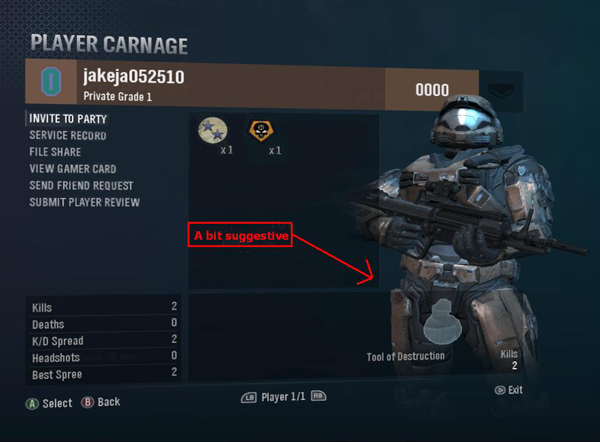 RESULTS: Tool of Destruction overlaps the crotch of the character EXPECTED: Tool of Destruction does not overlap the crotch of the character IMPACT: Medium. Could be found offensive. The second crotch-related offense was supplied by Chris Carney who apparently plays internally under the hilariously ironic moniker, "Big Dude." Remember in the beta when you'd finish a game and you'd get a screen where credits rained down while your Spartan struck a heroic pose? Well at some point that broke and the camera became centered on the Spartan's heroic nether regions. "It's particularly unsettling when the Spartan shifts his weight and turns slightly, it's just right there in your face", explained Carney.