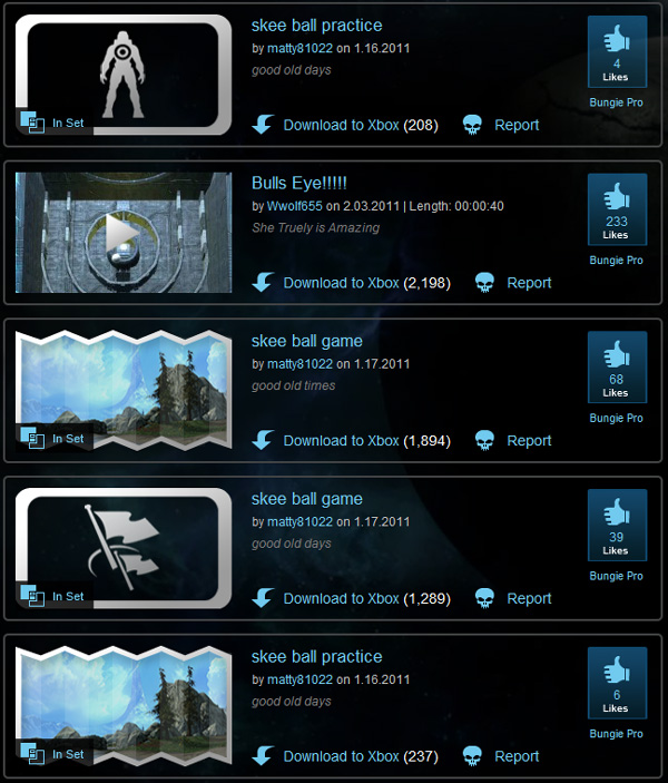 But as always, there can be only one left standing at the end. Eat your heart out Michael Bay. That is some good 'splosion. Once again, we're mighty impressed by all the offerings we received. We doled out several stars for outstanding work. And since we got such a good turnout, we'll probably stick with the in game stuff for next week as well. Expect explicit details on Monday morning. Blame StoshSometimes we come across community craftsmanship that simply blows our minds. We always expect that players will do the unexpected, but this week Stosh dug up a map and game variant that made our minds melt. Using an ingenious combination of Forge pieces, the Stockpile game engine, and creative ingenuity, this player made it possible to not only play Skee Ball in Forge, but to have the game engine tally your score correctly. Don't believe it? Click the links below to download it and see for yourself. That's it for this week. See you soon. |
