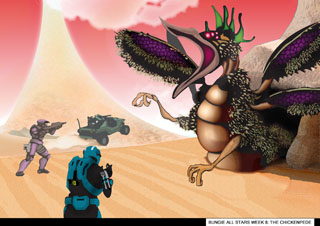 I understand if you never want to speak to me again. I've Got a Jet Pack!If you've made it this far, I applaud your dedication and cast iron stomach. Though the Jet Pack screenshots are indeed sweet, I fear they will not be sweet enough to rid your mouth of the bitter taste of Chickenpede. Still, we must go on. Feel free to click on any of the Jet Pack screenshots to check out the high resolution version. I'll spare you the higher resolution versions of Chickenpede. I can't, in good conscience, subject you to them. Seven stars again this week. I'll dole them out within the hour. More to come next week. Blame StoshStosh has been busy prepping Bungie.net for the release of the Defiant Map Pack. Yet, he still makes time for you. He loves you and he toils only for your entertainment. Be good. See you next week. |