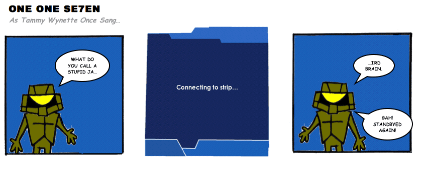 On April 30, 2003, Stuntmutt began turning in episodes of a new comic known as One One Se7en. We'll present them here, in the order in which they were submitted, as they come in. New submissions were added Monday, Wednesday, and Friday. On March 3, 2008, One One Se7en was retired from regular releases - Stunt's life got a tad too busy for 3 strips per week. (He still comes by with new content when the situation arises, however.)