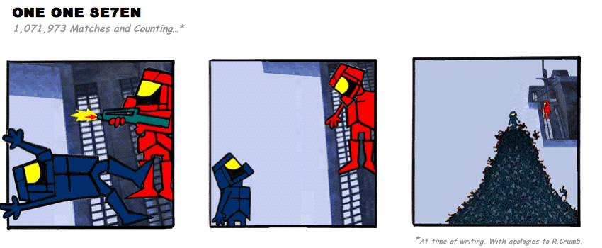 On April 30, 2003, Stuntmutt began turning in episodes of a new comic known as One One Se7en. We'll present them here, in the order in which they were submitted, as they come in. New submissions were added Monday, Wednesday, and Friday. On March 3, 2008, One One Se7en was retired from regular releases - Stunt's life got a tad too busy for 3 strips per week. (He still comes by with new content when the situation arises, however.)