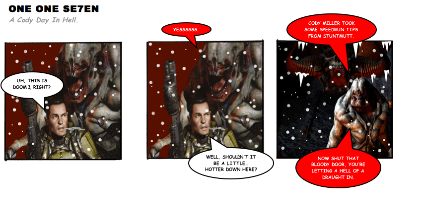 On April 30, 2003, Stuntmutt began turning in episodes of a new comic known as One One Se7en. We'll present them here, in the order in which they were submitted, as they come in. New submissions were added Monday, Wednesday, and Friday. On March 3, 2008, One One Se7en was retired from regular releases - Stunt's life got a tad too busy for 3 strips per week. (He still comes by with new content when the situation arises, however.)