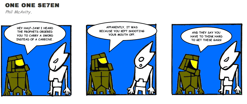 On April 30, 2003, Stuntmutt began turning in episodes of a new comic known as One One Se7en. We'll present them here, in the order in which they were submitted, as they come in. New submissions were added Monday, Wednesday, and Friday. On March 3, 2008, One One Se7en was retired from regular releases - Stunt's life got a tad too busy for 3 strips per week. (He still comes by with new content when the situation arises, however.)