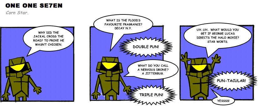 On April 30, 2003, Stuntmutt began turning in episodes of a new comic known as One One Se7en. We'll present them here, in the order in which they were submitted, as they come in. New submissions were added Monday, Wednesday, and Friday. On March 3, 2008, One One Se7en was retired from regular releases - Stunt's life got a tad too busy for 3 strips per week. (He still comes by with new content when the situation arises, however.)