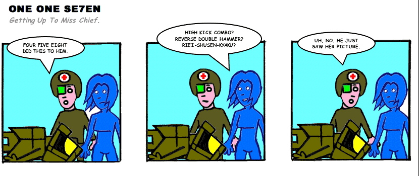 On April 30, 2003, Stuntmutt began turning in episodes of a new comic known as One One Se7en. We'll present them here, in the order in which they were submitted, as they come in. New submissions were added Monday, Wednesday, and Friday. On March 3, 2008, One One Se7en was retired from regular releases - Stunt's life got a tad too busy for 3 strips per week. (He still comes by with new content when the situation arises, however.)