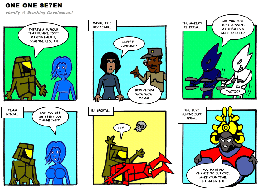 On April 30, 2003, Stuntmutt began turning in episodes of a new comic known as One One Se7en. We'll present them here, in the order in which they were submitted, as they come in. New submissions were added Monday, Wednesday, and Friday. On March 3, 2008, One One Se7en was retired from regular releases - Stunt's life got a tad too busy for 3 strips per week. (He still comes by with new content when the situation arises, however.)