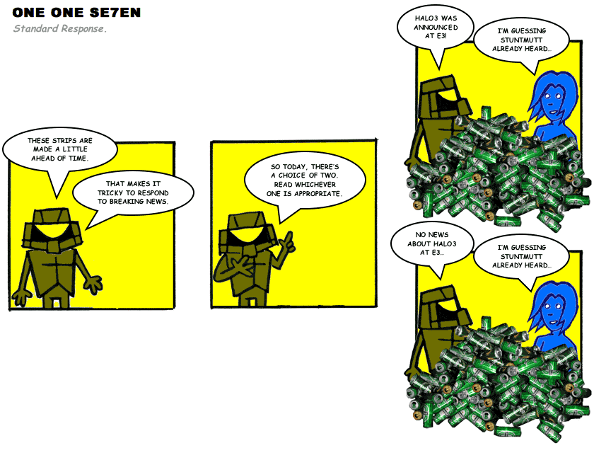 On April 30, 2003, Stuntmutt began turning in episodes of a new comic known as One One Se7en. We'll present them here, in the order in which they were submitted, as they come in. New submissions were added Monday, Wednesday, and Friday. On March 3, 2008, One One Se7en was retired from regular releases - Stunt's life got a tad too busy for 3 strips per week. (He still comes by with new content when the situation arises, however.)