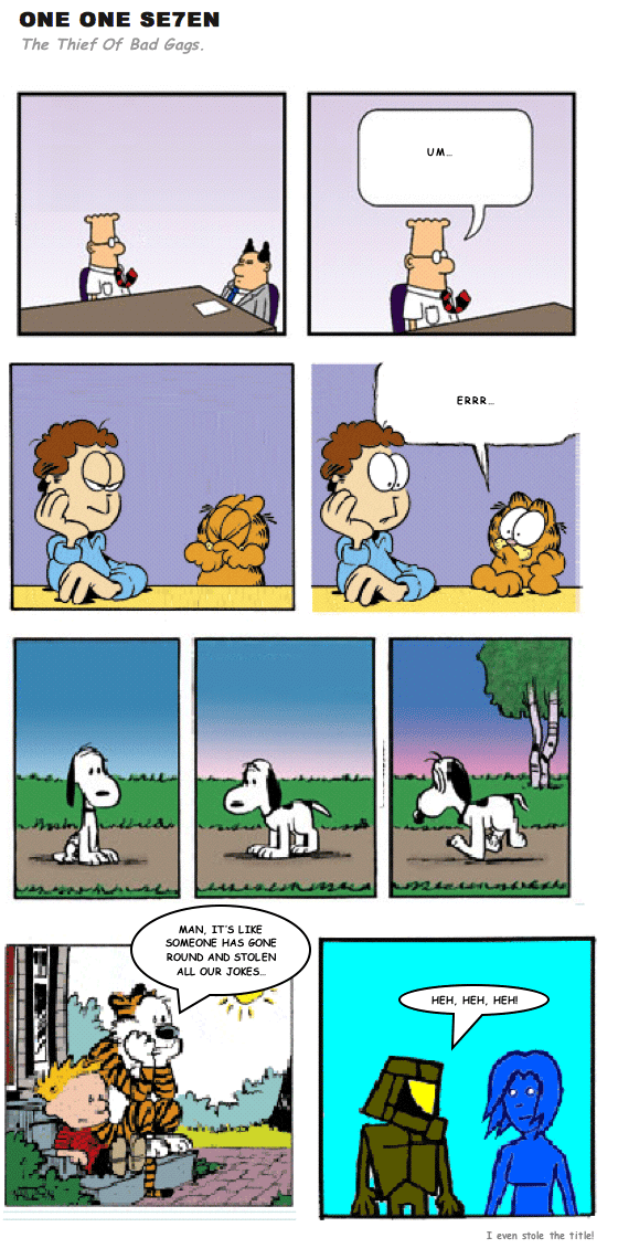 On April 30, 2003, Stuntmutt began turning in episodes of a new comic known as One One Se7en. We'll present them here, in the order in which they were submitted, as they come in. New submissions were added Monday, Wednesday, and Friday. On March 3, 2008, One One Se7en was retired from regular releases - Stunt's life got a tad too busy for 3 strips per week. (He still comes by with new content when the situation arises, however.)