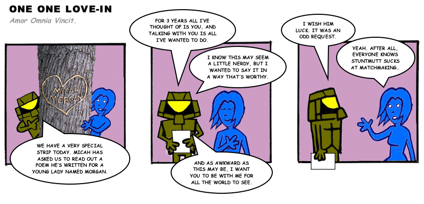 On April 30, 2003, Stuntmutt began turning in episodes of a new comic known as One One Se7en. We'll present them here, in the order in which they were submitted, as they come in. New submissions were added Monday, Wednesday, and Friday. On March 3, 2008, One One Se7en was retired from regular releases - Stunt's life got a tad too busy for 3 strips per week. (He still comes by with new content when the situation arises, however.)