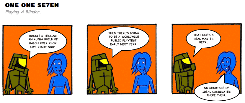 On April 30, 2003, Stuntmutt began turning in episodes of a new comic known as One One Se7en. We'll present them here, in the order in which they were submitted, as they come in. New submissions were added Monday, Wednesday, and Friday. On March 3, 2008, One One Se7en was retired from regular releases - Stunt's life got a tad too busy for 3 strips per week. (He still comes by with new content when the situation arises, however.)