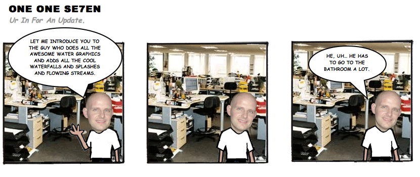 On April 30, 2003, Stuntmutt began turning in episodes of a new comic known as One One Se7en. We'll present them here, in the order in which they were submitted, as they come in. New submissions were added Monday, Wednesday, and Friday. On March 3, 2008, One One Se7en was retired from regular releases - Stunt's life got a tad too busy for 3 strips per week. (He still comes by with new content when the situation arises, however.)