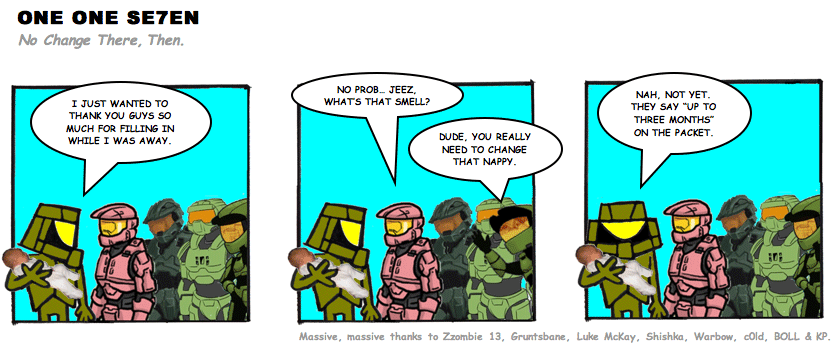 On April 30, 2003, Stuntmutt began turning in episodes of a new comic known as One One Se7en. We'll present them here, in the order in which they were submitted, as they come in. New submissions were added Monday, Wednesday, and Friday. On March 3, 2008, One One Se7en was retired from regular releases - Stunt's life got a tad too busy for 3 strips per week. (He still comes by with new content when the situation arises, however.)